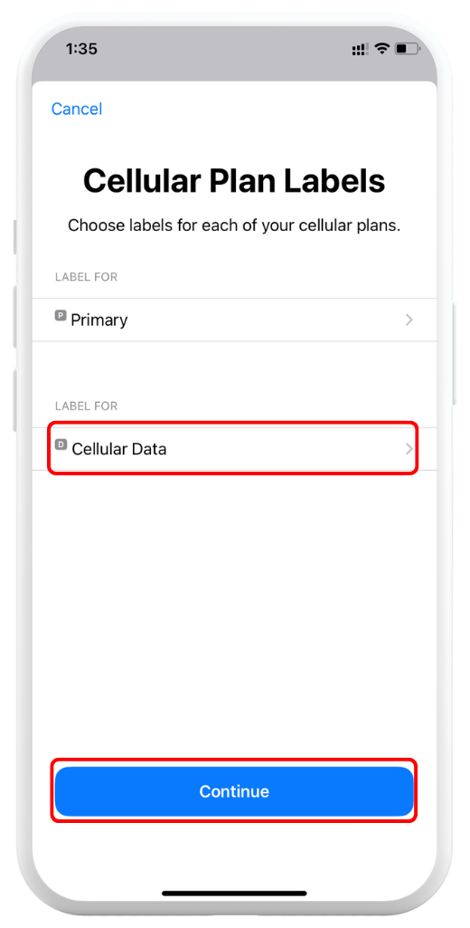 Select your new eSIM for Cellular/Mobile Data → Tap Continue