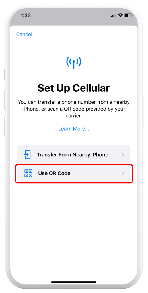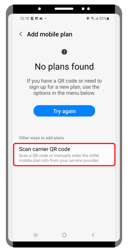 Tap Add mobile plan, then tap Scan carrier QR code.