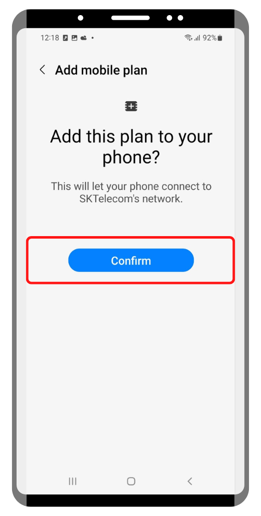 Enter the SM-DP+ Address & Activation Code by copying it, tap Connect, then tap Confirm.