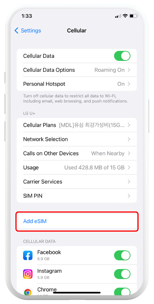 Go to Settings > Cellular/Mobile Data > Add eSIM (or Set up Mobile Service)