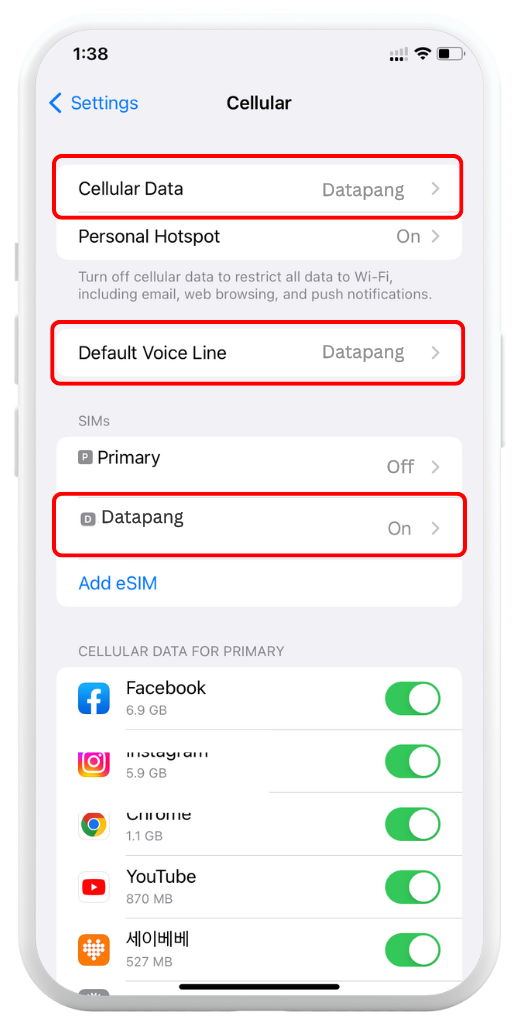 Important: If you are not yet in your destination country, set Cellular Data to your Primary SIM. Switch to Datapang only after arrival.