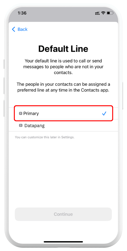 Set Primary as your Default Line → Tap Continue