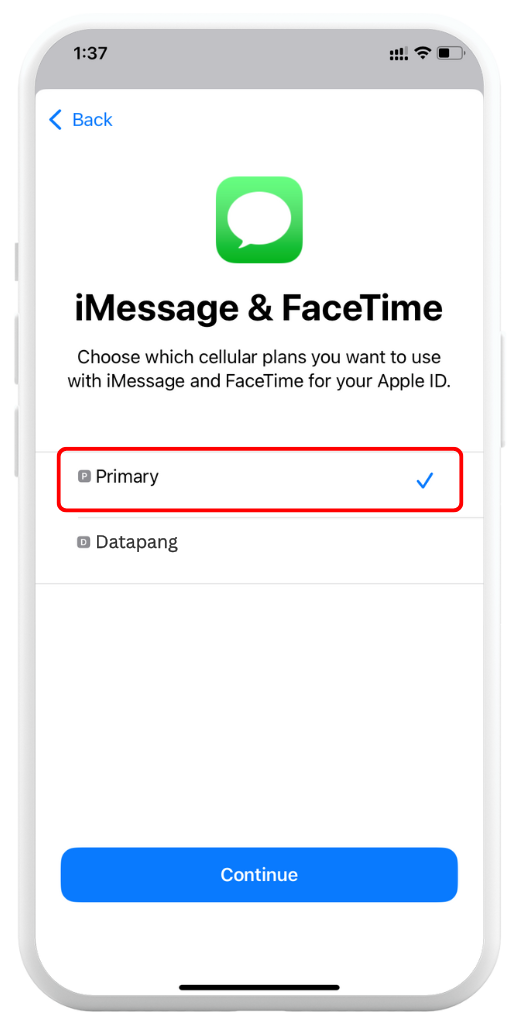 Choose Primary for iMessage & FaceTime → Tap Continue